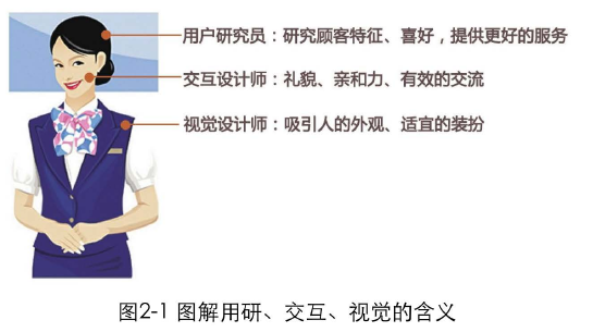 好的用戶體驗(yàn),就如同彬彬有禮的服務(wù)人員,不但能馬上解決用戶的問題,其優(yōu)美的談吐、機(jī)智的反應(yīng),也會給用戶一次非常美妙的體驗(yàn)。如果把產(chǎn)品比做圖2-1左側(cè)的這個服務(wù)人員,那么這3個職位的作用正如圖中所描述的那樣。