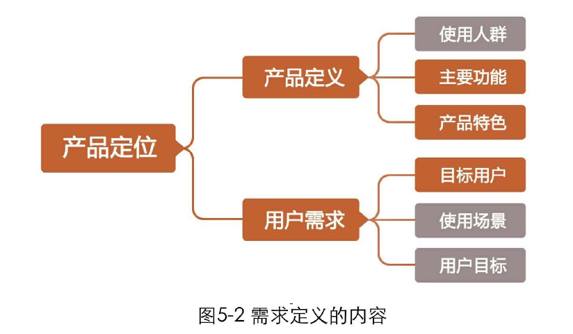 產(chǎn)品定位實(shí)際上就是關(guān)于產(chǎn)品的目標(biāo)、范圍、特征等約束條件,它包括兩方面的內(nèi)容:產(chǎn)品定義和用戶需求。產(chǎn)品定義主要由產(chǎn)品經(jīng)理從網(wǎng)站角度考慮,用戶需求主要由設(shè)計(jì)師從用戶角度考慮。最終的產(chǎn)品定位應(yīng)該是綜合考慮兩者關(guān)系的結(jié)果。需求定義的內(nèi)容如圖5-2所示。