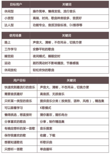 需要說明的是,休閑型、小資型、達(dá)人型用戶雖然有區(qū)別,但他們之間并不是絕對(duì)獨(dú)立和互斥的關(guān)系,他們的一些使用場(chǎng)景和用戶目標(biāo)甚至是重合的,比如休閑型和小資型用戶可能都有分享音樂的需求。因此在發(fā)散使用場(chǎng)景和用戶目標(biāo)時(shí),不需要太受人群類型的限制。"放” 得越寬,“收”的時(shí)候才越有選擇余地,越不會(huì)遺漏重要內(nèi)容。