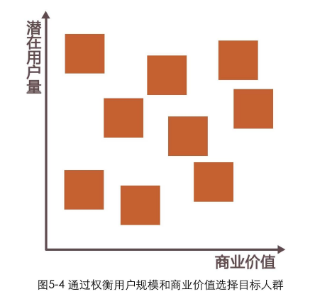 該選擇哪種類型作為產(chǎn)品的目標(biāo)用戶,需要綜合權(quán)衡用戶對(duì)公司的價(jià)值以及潛在需求量。別忘了,平衡商業(yè)價(jià)值和用戶需求本來就是設(shè)計(jì)師需要特別關(guān)注到的。在一個(gè)坐標(biāo)平面上對(duì)潛在用戶進(jìn)行分布羅列,坐標(biāo)平面的2個(gè)坐標(biāo)軸分別是潛在用戶量和商業(yè)價(jià)值 (包含對(duì)推廣、營(yíng)銷成本的考慮),如圖5-4所示。我們優(yōu)先考慮最右上角那些潛在用戶量大和商業(yè)價(jià)值大 (推廣成本低) 的用戶。因?yàn)橐瑫r(shí)考慮到產(chǎn)品利益和用戶需求,所以這項(xiàng)工作最好由產(chǎn)品經(jīng)理和設(shè)計(jì)師配合完成。