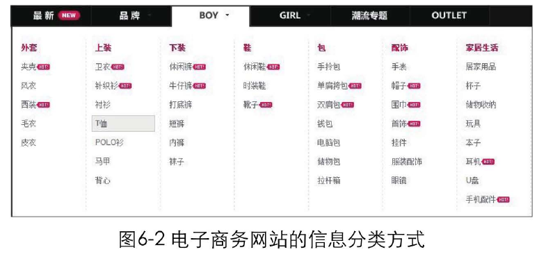 比如,在生活中,要買一件男士T恤,會首先找到商場賣男裝的樓層,再找到店鋪中擺放上衣的區(qū)域去挑選 恤。在電子商務(wù)網(wǎng)站對商品進(jìn)行組織時,同樣采用了這種 “男裝>上裝>T恤" 的分類方式,如圖6-2所示。如果分類方式改成 "上裝>男裝>T恤",你會不會覺得怪怪的呢? 不符合邏輯習(xí)慣的分類很容易把用戶弄糊涂 。