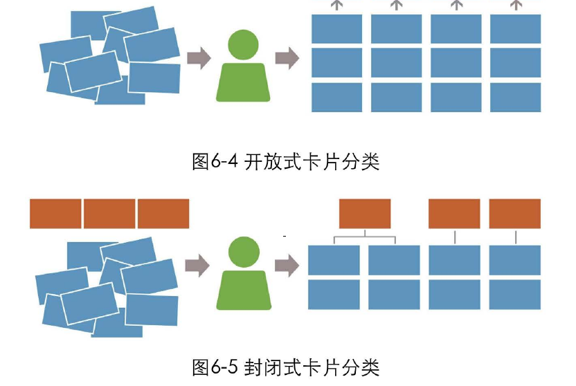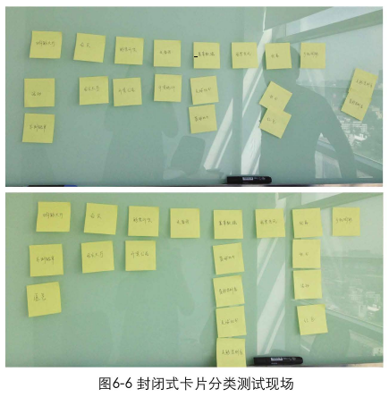 開放式: 開放式的卡片分類會給用戶足夠的自由度來進(jìn)行信息歸類。設(shè)計師將完全打亂的卡片分發(fā)給用戶,用戶可以完全自由地決定把卡片分為幾組、每組有多少張卡片。最后再由用戶為分好組的卡片命名。開放的方式給了用戶極大的發(fā)揮空間。設(shè)計師可能會得到更加豐富的分類結(jié)果,如圖6-4所示。但對于內(nèi)容復(fù)雜、信息量龐大的網(wǎng)站,開放式的分類方法可能會使結(jié)果變得不可控。