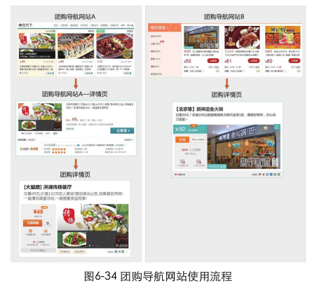 我們在團購時經(jīng)常會用到“團購導(dǎo)航網(wǎng)站”。這類網(wǎng)站聚合了不同團購網(wǎng)站的商品。在有些團購導(dǎo)航網(wǎng)站的列表頁點擊某一商品時,首先會跳轉(zhuǎn)到該導(dǎo)航網(wǎng)站的詳情頁。里面提供了一些團購商品的簡介,但是并沒有提供更多詳情。如果我要團購一份雙人晚餐,只知道商家和價格顯然是不夠的,我還需要知道具體有哪些配菜、餐館的地址、有無消費限制、是否需要預(yù)約等信息。這些信息都會影響到我是否要購買。于是我還要點擊導(dǎo)航網(wǎng)站詳情頁的“去看看”按鈕跳轉(zhuǎn)到我要購買產(chǎn)品的團購詳情頁。而有些團購導(dǎo)航網(wǎng)站,當我在列表頁點擊某一商品后,會直接跳轉(zhuǎn)到我最后需要購買商品的那個頁面,省去了中間多余的步驟。