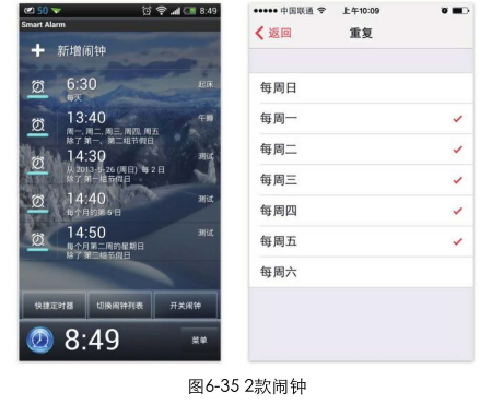 圖6-35所示為2款鬧鐘應(yīng)用。一款提供了非常強大的功能。在設(shè)置鬧鐘時可以有多種重復(fù)方式: 每天、每周的某些日子、每周的某些日子和第N組節(jié)假日、僅第N組節(jié)假日、每隔N 日、每月的某一日、每月第N周的某日,另一款只是簡單地讓用戶選擇每周幾重復(fù)。如果是你,會喜歡哪款呢?