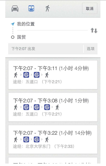 在Google Maps中,如果用戶想查詢路線,就一定要輸入起點和終點,這是無法省略的過程。但是在查詢路線時,Google Maps會利用定位功能自動將起點定位為 “我的位置",減少用戶的操作,如圖6-36所示。