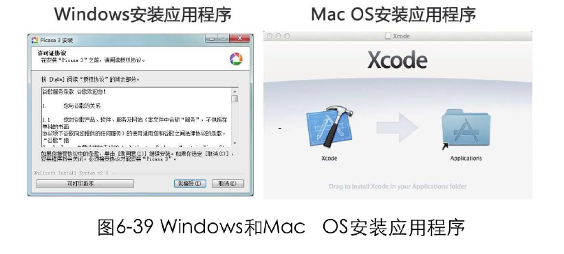 想想安裝應(yīng)用程序時Windows系統(tǒng)是怎么做的? 讓你去閱讀安裝許可協(xié)議,選擇安裝在哪個盤中,不停地點擊下步,還有很多高級選項讓你去琢磨和修改。而在Mac OS系統(tǒng)下,用戶僅需要簡單地拖拽,將應(yīng)用圖標拖到Application文件夾中即可完成應(yīng)用程序的安裝。也許沒用過MacIOS的朋友永遠都不會覺得在Windows中安裝軟件是件很麻煩的事,因為已經(jīng)習以為常了。但一旦用過這種簡單直接的安裝方式,便會由衷喜歡上它,如圖6-39所示。