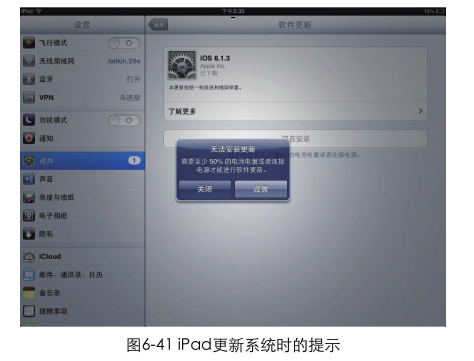 iPad在更新系統(tǒng)時,會提前檢測用戶的電量。如果電量不足以支撐完成更新,會提示用戶將iPod插上電源再來更新。試想一下,如果沒有這個提醒會怎樣呢? 用戶花費了大量的時間下載更新,在安裝到一半時卻因為沒電而關(guān)機了 !用戶需要連接電源再次重新更新,更新的過程雖然沒有冗余步驟,但因為缺少預(yù)先提示而導(dǎo)致的重復(fù)操作也會使操作流程變復(fù)雜,如圖6-41所示。