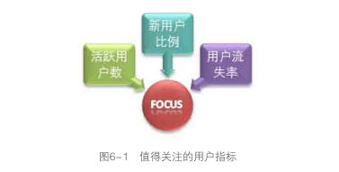 從上面可以看出,我們在獲得訪問用戶數(shù)、新用戶數(shù)、活躍用戶數(shù)、流失用戶數(shù)、回訪用戶數(shù)的同時,通過計算還得到了老用戶數(shù)、留存用戶數(shù)等衍生用戶指標,同時得到了新用戶比例、活躍用戶比例、用戶流失率、用戶訪問率等復合指標。這些指標給我們的分析提供了足夠的支持,而且指標的定義相對明確,有各自的應用價值,不會存在相互重復或重疊的部分,類似這樣的網(wǎng)站用戶指標體系是比較完整和規(guī)范的。至于上面提到的其他用戶指標,也許在某些時候基于某些分析才會用到,一般不需要作為 日常指標,可以使用臨時統(tǒng)計或者從其他數(shù)據(jù)中間接獲取。 當我們已經(jīng)定義了一套適合分析用戶的指標體系之后,可以看一下哪些指標值得重點去關注,這個時候可以設想一下 : 如果你想用盡量簡潔有效的數(shù)據(jù)了解一個網(wǎng)站或產(chǎn)品的用戶情況, 你會問哪幾個用戶數(shù)據(jù)? 如果是我提問,我只會問三個指標:活躍用戶數(shù)、新用戶比例和用戶流失率,如圖6-1所示。