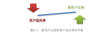 新用戶比例反映著網(wǎng)站或產(chǎn)品的推廣能力,渠道的鋪設以及帶來的效果,新用戶比例不僅是評估市場部門績效的一個關鍵指標,同時也是反映網(wǎng)站和產(chǎn)品發(fā)展狀況的重要指標。然而,只看新用戶比例是不夠的,需要結合著用戶流失率一起看,我見過流失率98%的網(wǎng)站,也見過流失率20%左右的產(chǎn)品,流失率會根據(jù)產(chǎn)品對用戶黏性的不同而顯得參差不齊。用戶流失率反映了網(wǎng)站或者產(chǎn)品保留用戶的能力,即新用戶比例反映的是用戶“進來 ”的情況,用戶流失率反映的是用戶“離開"的情況,結合這兩個指標會有下面三類情況,代表了三種不同的產(chǎn)品發(fā)展階段,如圖6-2所示。