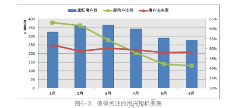 網(wǎng)站的活躍用戶數(shù)體現(xiàn)了網(wǎng)站制作當前實際掌握的用戶數(shù)量,結合新用戶比例和用戶流失率可以分析網(wǎng)站用戶的發(fā)展情況,通過這三個指標基本可以掌控網(wǎng)站用戶的全景??梢詫⑦@三個指標放在一張圖表中來分析網(wǎng)站用戶的狀況,如圖6-3所示。