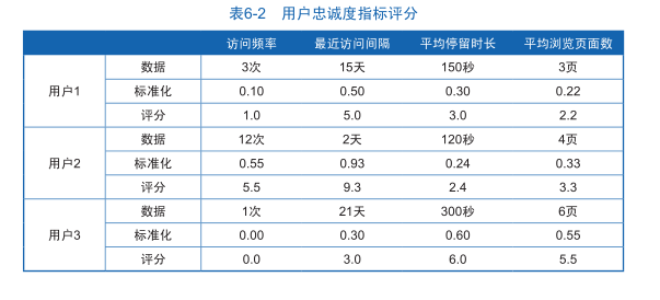 表6-2中,用戶忠誠(chéng)度的4個(gè)分析指標(biāo)經(jīng)過標(biāo)準(zhǔn)化處理后統(tǒng)一以10分制的形式輸出,這樣就能直接區(qū)分每個(gè)用戶的每項(xiàng)指標(biāo)的表現(xiàn)好壞。基于每個(gè)指標(biāo)的評(píng)分,可以對(duì)用戶進(jìn)行篩選,比如營(yíng)銷部門重點(diǎn)跟進(jìn)經(jīng)常訪問網(wǎng)站的用戶,可以選擇訪問頻率評(píng)分大于3分的用戶,或者重點(diǎn)跟進(jìn)用戶訪問參與度較高的用戶,可以篩選平均停留時(shí)間和平均訪問頁(yè)面數(shù)都大于3分的用戶,這樣能夠幫助營(yíng)銷部門迅速定位忠誠(chéng)用戶。