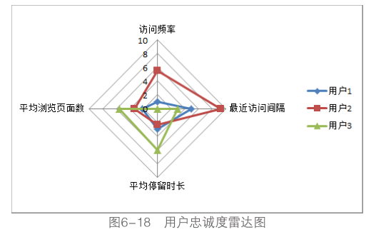 圖6-18使用了表6-2中三位用戶的評(píng)分?jǐn)?shù)據(jù)繪制而成,能夠非常形象地表現(xiàn)用戶忠誠(chéng)度在各指標(biāo)上的表現(xiàn)情況,用戶1的整體忠誠(chéng)度較低,用戶2在訪問頻率和訪問間隔具有較好表現(xiàn),而用戶aki訪問具有相對(duì)較高的參與度。使用雷達(dá)圖分析用戶的忠誠(chéng)度主要有如下優(yōu)勢(shì):