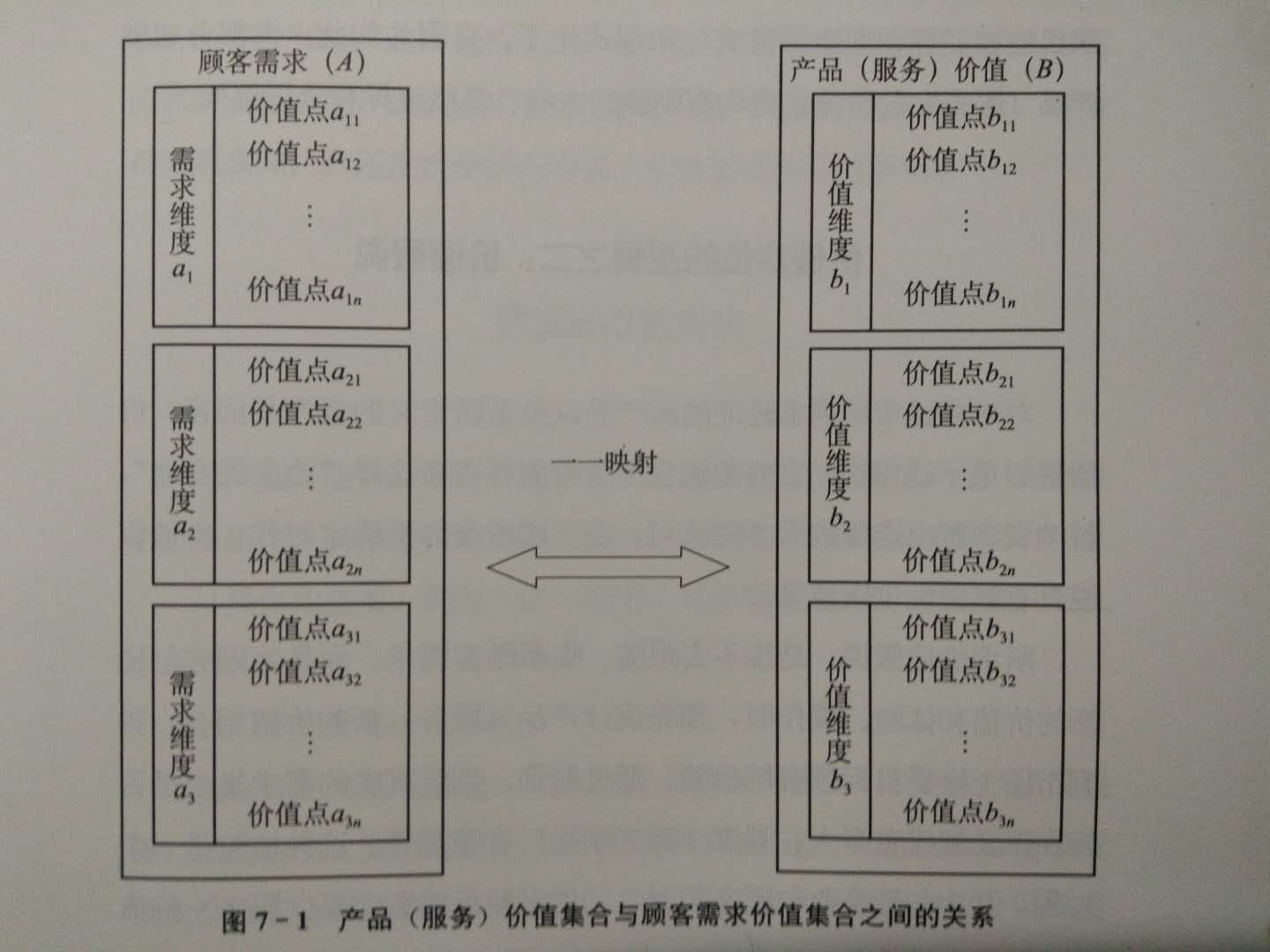 我們可以把顧客需求定義為A集合,產(chǎn)品(服務(wù))所提供的價值定義為B集合,A集合和B 集合中有多個元素--價值點。B集合中的每個價值點都是對A集合中每個價值點的體認(rèn)、理解、臨摹和追隨,顧客需求的價值點是產(chǎn)品(服務(wù))價值點的原象 價值定位基礎(chǔ)和依據(jù)),顯然,兩個集合之間存在一一映射的關(guān)系 (見圖7-1)。