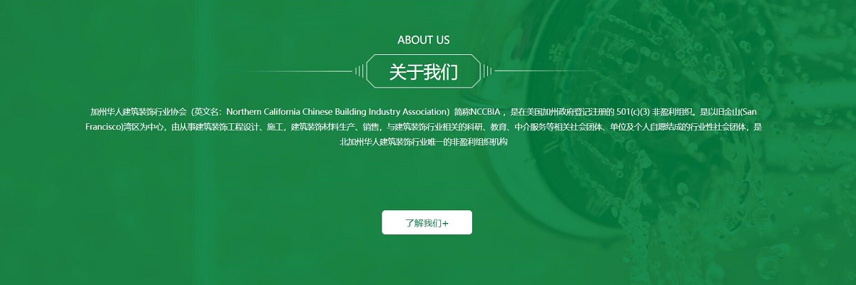 加州華人建筑裝飾行業(yè)協(xié)會(huì)(英文名:Northern California Chinese Building Industry Association)簡(jiǎn)稱NCCBIA ,是在美國(guó)加州政府登記注冊(cè)的 501(c)(3) 非盈利組織。是以舊金山(San Francisco)灣區(qū)為中心,由從事建筑裝飾工程設(shè)計(jì)、施工,建筑裝飾材料生產(chǎn)、銷售,與建筑裝飾行業(yè)相關(guān)的科研、教育、中介服務(wù)等相關(guān)社會(huì)團(tuán)體、單位及個(gè)人自愿結(jié)成的行業(yè)性社會(huì)團(tuán)體,是北加州華人建筑裝飾行業(yè)唯一的非盈利組織機(jī)構(gòu)網(wǎng)站建設(shè)