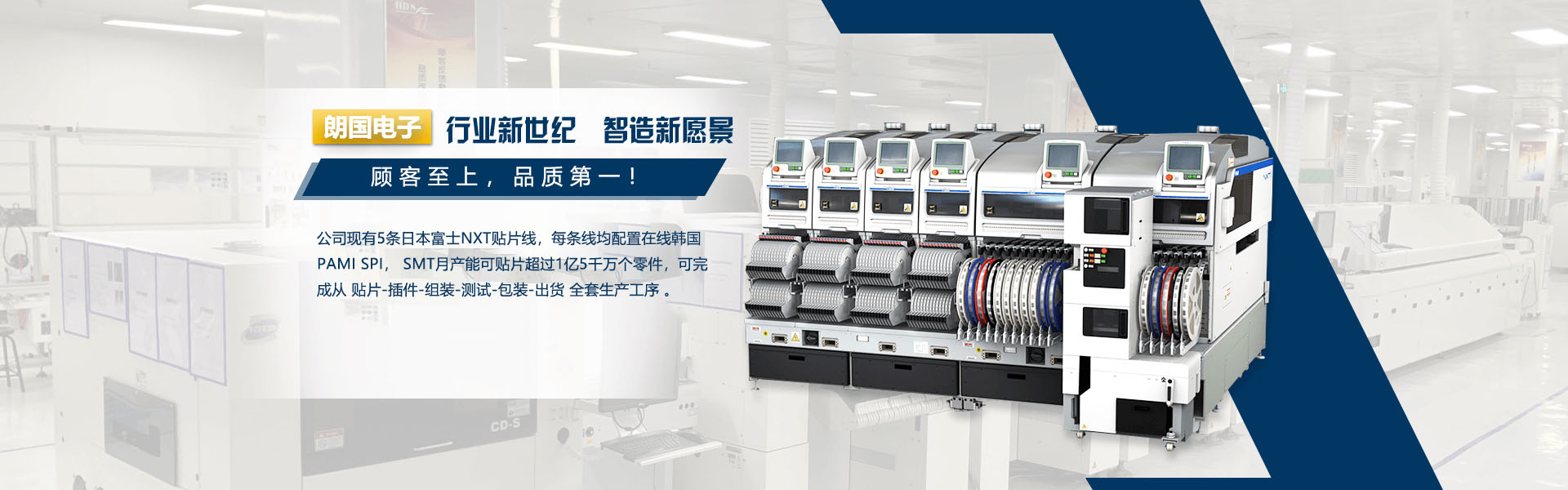 公司現有5條日本富士NXT貼片線,每條線均配置在線韓國PAMI SPI, SMT月產能可貼片超過1億5千萬個零件,可完成從 貼片-插件-組裝-測試-包裝-出貨 全套生產工序 。