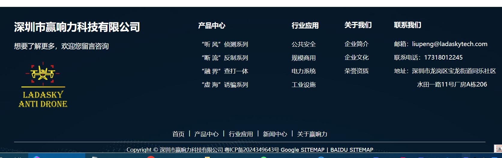 深圳市贏響力科技有限公司企業(yè)網(wǎng)站建設(shè)方案 日期 : 2025-06-28 16:27:22 深圳市贏響力科技有限公司專注于高科技通信電子產(chǎn)品領(lǐng)域,是無人機反制行業(yè)的領(lǐng)先企業(yè)。 公司在設(shè)計開發(fā)、生產(chǎn)制造、銷售及技術(shù)服務(wù)方面擁有卓越的能力,其核心無人機反制設(shè)備如探測儀、干擾儀等系列產(chǎn)品,具備自主知識產(chǎn)權(quán)與外觀專利,彰顯了強大的技術(shù)創(chuàng)新實力。經(jīng)過長期發(fā)展,公司在規(guī)模、管理和研發(fā)體系上不斷完善,營造了良好的創(chuàng)新創(chuàng)業(yè)環(huán)境,為無人機反制業(yè)務(wù)奠定了堅實基礎(chǔ)。 在無人機應(yīng)用與監(jiān)管愈發(fā)關(guān)鍵的當(dāng)下,贏響力科技憑借多年在無線電感知與目標(biāo)識別定位領(lǐng)域的深厚技術(shù)沉淀和豐富經(jīng)驗,在無人機偵測、識別、定位、跟蹤和管制等環(huán)節(jié)占據(jù)優(yōu)勢地位,尤其在將 TDOA 網(wǎng)格化無人機管控技術(shù)產(chǎn)品化和商用推廣方面走在前列,其城市級網(wǎng)格化無人機管控解決方案具備 “靈活預(yù)案、遠距預(yù)警、身份識別、精準(zhǔn)定位、實時追蹤、快速處置” 等多功能,支持大規(guī)模組網(wǎng)和大區(qū)域無縫覆蓋,成為行業(yè)標(biāo)桿。公司持續(xù)致力于技術(shù)研發(fā)與創(chuàng)新,為保障國家安全和無人機產(chǎn)業(yè)的有序發(fā)展貢獻力量。 上一篇:深圳市遠中知識產(chǎn)權(quán)代理有限公司與海洋網(wǎng)絡(luò)簽訂網(wǎng)站建設(shè) 下一篇:FENDER MUSICALINSTRUMENTS CORPORATION.ALL RIGHTS RESERVED.網(wǎng)站