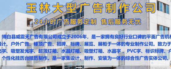 博白縣威*天廣告有限公司是一家技術(shù)先進(jìn)、實(shí)力雄厚,集廣告設(shè)計(jì)、戶(hù)外廣告、樓頂廣告、招牌、標(biāo)牌、展覽、展柜于一體的專(zhuān)業(yè)制作公司。致力于門(mén)頭LED發(fā)光字、吸塑發(fā)光字、超薄燈箱、水晶燈箱、吸塑燈箱、水晶字 、PVC字、標(biāo)識(shí)標(biāo)牌、戶(hù)內(nèi)外廣告、個(gè)性化掛歷臺(tái)掛歷制作。是一家集設(shè)計(jì)、制作、安裝,為一體的綜合性廣告公司。專(zhuān)業(yè)制作數(shù)碼寫(xiě)真、噴繪、印刷彩業(yè)、海報(bào)、絲網(wǎng)印、條幅、錦旗、彩旗、綬帶、衣服印字、禮品印字、字牌、制度牌、胸牌、標(biāo)牌、廣告牌、樓牌、銅牌、鋁牌、門(mén)牌號(hào)、門(mén)頭、燈箱、金卡、銀卡、貴賓卡、會(huì)員卡、胸卡、展板、X展架、易拉寶、鈦金字、鐵皮字、水晶字、芙蓉字、發(fā)光字、LED霓虹燈、顯示屏、吸塑、拱門(mén)、墻體廣告發(fā)布、車(chē)體廣告發(fā)布等。 公司擁有大型的噴繪、寫(xiě)真、橫幅、刻字、打印等專(zhuān)業(yè)廣告設(shè)備,作業(yè)面積達(dá)100多平米,交通便利。公司從創(chuàng)立至今,擁有豐富的經(jīng)驗(yàn),通過(guò)和各界客戶(hù)的合作,已形成一套自己的運(yùn)作方式。