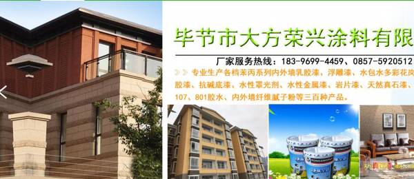 畢節(jié)市*興涂料有限公司位于貴州省畢節(jié)市奢香故里,企業(yè)創(chuàng)始團(tuán)隊(duì)從事該行業(yè)三十年,有實(shí)力雄厚的施工隊(duì)伍,技術(shù)力量強(qiáng),是集科研、開發(fā)、制造為一體的現(xiàn)代化綜合型企業(yè)。畢節(jié)市榮興涂料有限公司專業(yè)生產(chǎn)各檔苯丙系列內(nèi)外墻乳膠漆、浮雕漆、炮水多彩花崗巖、彈性乳膠漆、抗堿底漆、水性罩光劑、水性金屬漆、漆、天然真石漆、防水涂料、107. 801膠水、內(nèi)外墻纖維膩?zhàn)臃鄣热俜N產(chǎn)品,價(jià)格親民,產(chǎn)品齊全,具有耐磨、抗老化、防水、抗污,附著力極強(qiáng)等功能,綠色環(huán)保,節(jié)省涂料。