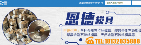 河間市恩*模具有限公司坐落于華北平原 中部,地處京、津、石三地的河北省河間市西村工業(yè)區(qū),交通便利,地理位置優(yōu)越。我公司專業(yè)生產各種金剛石拉絲模具、聚晶金剛石異型模具、聚晶金剛石拉絲模 具、天然金剛石拉絲模具、硬質合金(鎢鋼)模具等產品,并具有各種機械設備。我公司占地面積1000多平米,擁有一批技工,同時我公司積極引進先進機 械設備,自動檢測,顯示工作精度,保障產品品質。同時更注重質量控制和現(xiàn)場管理,強化過程監(jiān)控,確保生產的各類產品品質。我公司以質量為本,信譽至上為宗 旨。以優(yōu)良的售后服務得到廣大客戶的青睞,并在同行業(yè)中取得較高的知名度。