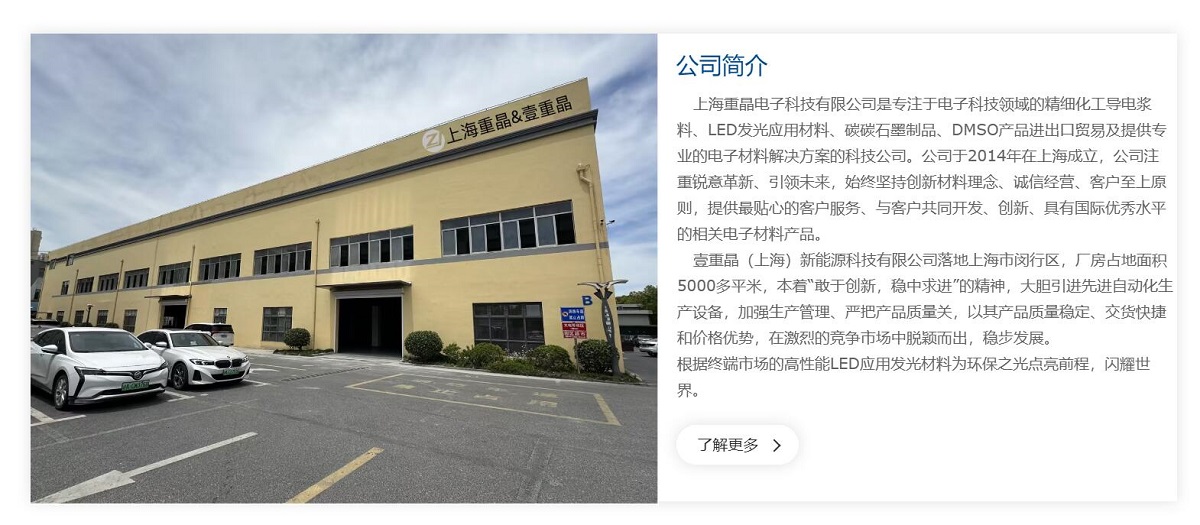 上海重晶電子科技有限公司是專注于電子科技領(lǐng)域的精細(xì)化工導(dǎo)電漿料、LED發(fā)光應(yīng)用材料、碳碳石墨制品、DMSO產(chǎn)品進(jìn)出口貿(mào)易及提供專業(yè)的電子材料解決方案的科技公司。公司于2014年在上海成立,公司注重銳意革新、引領(lǐng)未來,始終堅(jiān)持創(chuàng)新材料理念、誠(chéng)信經(jīng)營(yíng)、客戶至上原則,提供最貼心的客戶服務(wù)、與客戶共同開發(fā)、創(chuàng)新、具有國(guó)際優(yōu)秀水平的相關(guān)電子材料產(chǎn)品。