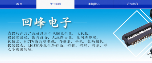 上海回峰電子科技有限公司是一家專業(yè)設(shè)計,研發(fā),生產(chǎn),銷售各種精密連接器和接插件專業(yè)廠商,產(chǎn)品廣泛應(yīng)用于電腦周邊、電子電訊類板對板、線對板精密連接器、連接線束、五金車件的研發(fā)與生產(chǎn)。主要有0.3mm、0.5mm、0.8mm、1.0mm、1.27mm、1.778mm、2.0mm、2.54mm、3.96mm、5.08mm等間距的高精密度連接器,產(chǎn)品包括:DIN41612歐式插座、IC插座、排針、排母、圓PIN排針、圓PIN排母、CPU保護座、PLCC插座、簡牛插座、牛角插座、壓線簡牛牛角、D-SUB/連接(DB/DP/DR/DVI)、RJ45網(wǎng)絡(luò)接口、RJ11電話接口、S端子接口、USB接口、DC電源座、音頻座、接線端子臺、WAFER、FFC/FPC、等;連接線束產(chǎn)品有端子線、扁平線、注塑線;五金車件主要有直徑0.8mm到6.0mm之間的圓孔針、插座車針、電源老化針套、裝爪簧PIN針等。