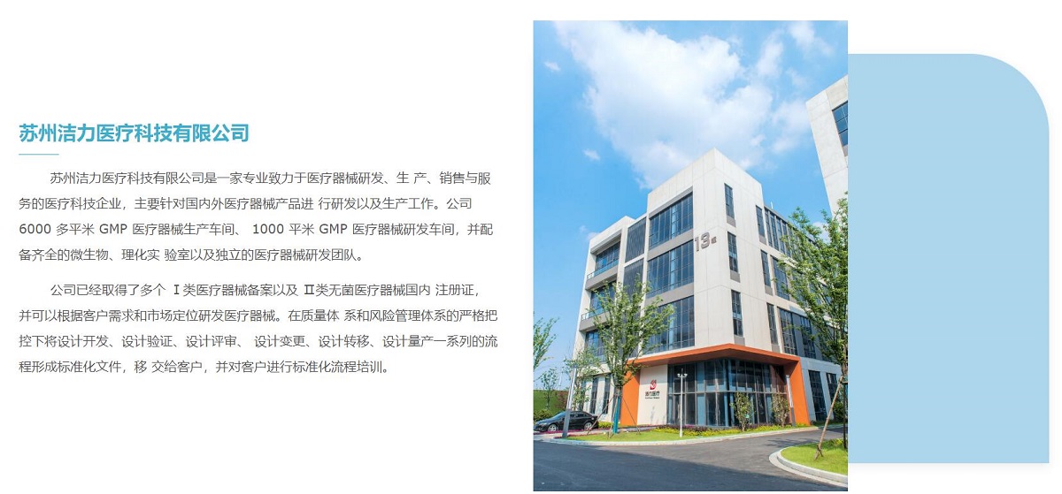 蘇州潔力醫(yī)療科技有限公司是一家專業(yè)致力于醫(yī)療器械研發(fā)、生 產(chǎn)、銷售與服務(wù)的醫(yī)療科技企業(yè),主要針對(duì)國(guó)內(nèi)外醫(yī)療器械產(chǎn)品進(jìn) 行研發(fā)以及生產(chǎn)工作。公司 6000 多平米 GMP 醫(yī)療器械生產(chǎn)車間、 1000 平米 GMP 醫(yī)療器械研發(fā)車間,并配備齊全的微生物、理化實(shí) 驗(yàn)室以及獨(dú)立的醫(yī)療器械研發(fā)團(tuán)隊(duì)。