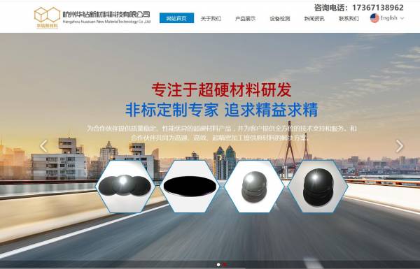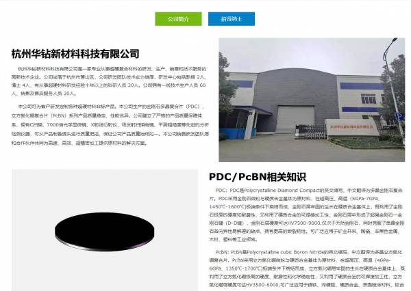 杭州華鉆新材料科技有限公司是一家專業(yè)從事超硬復(fù)合材料的研發(fā)、生產(chǎn)、銷售和技術(shù)服務(wù)的高新技術(shù)企業(yè)的網(wǎng)站建設(shè)。公司坐落于杭州市蕭山區(qū),公司研發(fā)團隊技術(shù)實力雄厚,研發(fā)中心包括教授 2人、博士 4人、有從事超硬材料研發(fā)經(jīng)驗十年以上的科研人員 20人。公司擁有一線技術(shù)生產(chǎn)人員 60人、銷售及售后服務(wù)人員 20人,本公司可為客戶研發(fā)定制各種超硬材料非標產(chǎn)品。本公司生產(chǎn)的金剛石多晶復(fù)合片(PDC)、立方氮化硼復(fù)合片(PcBN)系列產(chǎn)品質(zhì)量穩(wěn)定、性能優(yōu)異。公司建立了嚴格的產(chǎn)品質(zhì)量保障體系,擁有C掃描、7000倍光學顯微鏡、X射線衍射儀、場發(fā)射掃描電鏡、平面粗糙度等先進的分析檢測儀器,可從產(chǎn)品制備源頭進行質(zhì)量把控,保證公司產(chǎn)品質(zhì)量始終如一...