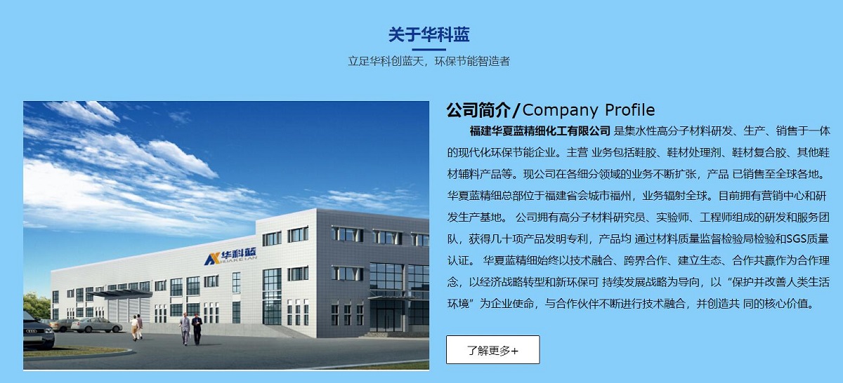 福建華夏藍精細化工有限公司 是集水性高分子材料研發(fā)、生產(chǎn)、銷售于一體的現(xiàn)代化環(huán)保節(jié)能企業(yè)。主營 業(yè)務(wù)包括鞋膠、鞋材處理劑、鞋材復(fù)合膠、其他鞋材輔料產(chǎn)品等。現(xiàn)公司在各細分領(lǐng)域的業(yè)務(wù)不斷擴張,產(chǎn)品 已銷售至全球各地。