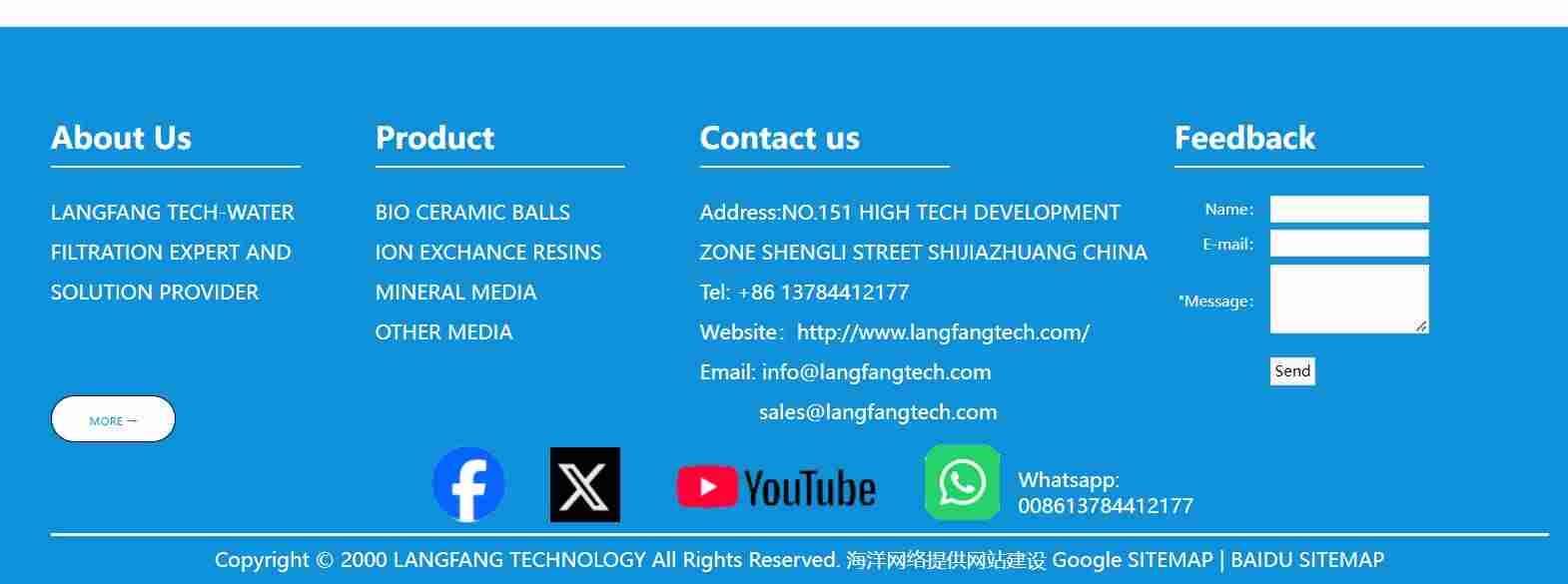 Langfang Technology,a high tech enterprise established in 2000,engagedin the field of water filtration media and resins.Our company established aprofessional team of R&D,production,sales&marketing,after-sale service.We focus on the innovation of new functional materials,discover industrialopportunities,constantly develop competitive and innovative products fordomestic and worldwide clients.Due to our strong technical power,steadyhigh-quality material supply,reasonable price and timely transportation,we have won a high reputation among customers worldwide!