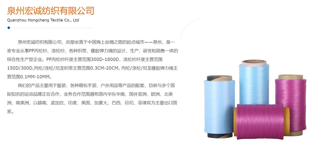 泉州宏誠(chéng)紡織有限公司,總部坐落于中國(guó)海上絲綢之路的起點(diǎn)城市——泉州,是一家專業(yè)從事PP丙綸紗、滌綸紗、各種織帶,橡膠彈力繩的設(shè)計(jì)、生產(chǎn)、研發(fā)和銷售一體的綜合性生產(chǎn)型企業(yè)。PP丙綸紗纖度主營(yíng)范圍300D-1800D,滌綸紗纖度主營(yíng)范圍150D/300D,丙綸/滌綸/尼龍織帶主營(yíng)范圍0.3CM-20CM, 丙綸/滌綸/尼龍橡膠彈力繩主營(yíng)范圍0.1MM-10MM。