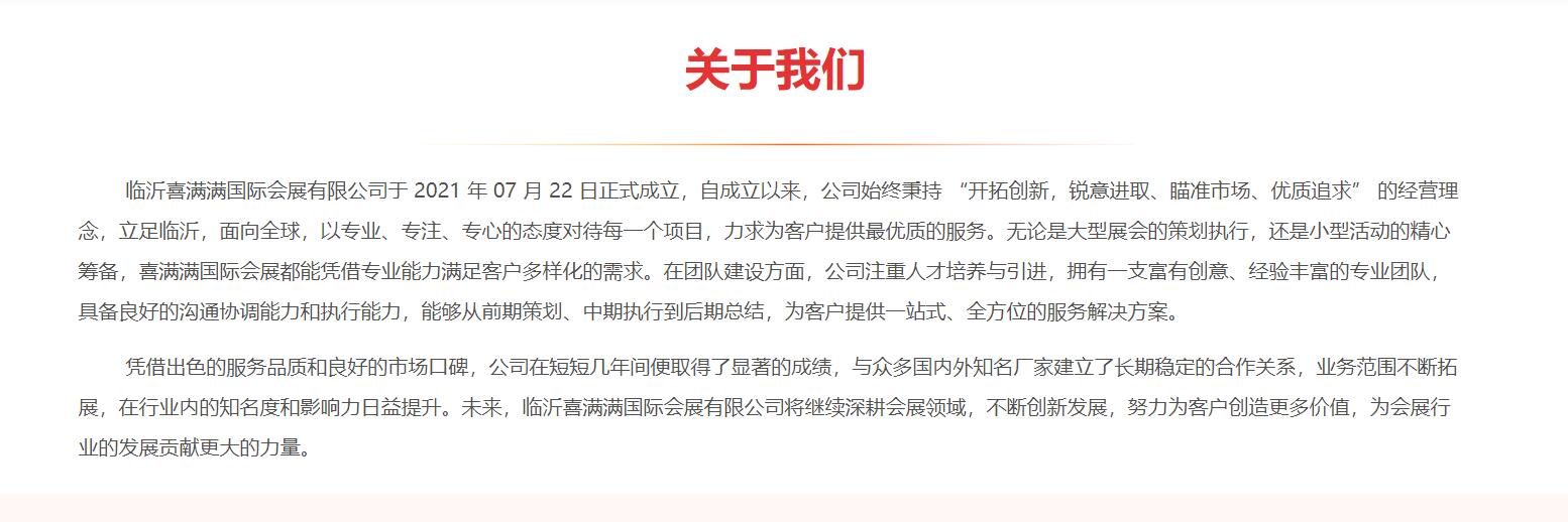 臨沂喜滿滿國(guó)際會(huì)展有限公司于 2021 年 07 月 22 日正式成立,自成立以來(lái),公司始終秉持 “開(kāi)拓創(chuàng)新,銳意進(jìn)取、瞄準(zhǔn)市場(chǎng)、優(yōu)質(zhì)追求” 的經(jīng)營(yíng)理念,立足臨沂,面向全球,以專業(yè)、專注、專心的態(tài)度對(duì)待每一個(gè)項(xiàng)目,力求為客戶提供最優(yōu)質(zhì)的服務(wù)。無(wú)論是大型展會(huì)的策劃執(zhí)行,還是小型活動(dòng)的精心籌備,喜滿滿國(guó)際會(huì)展都能憑借專業(yè)能力滿足客戶多樣化的需求。在團(tuán)隊(duì)建設(shè)方面,公司注重人才培養(yǎng)與引進(jìn),擁有一支富有創(chuàng)意、經(jīng)驗(yàn)豐富的專業(yè)團(tuán)隊(duì),具備良好的溝通協(xié)調(diào)能力和執(zhí)行能力,能夠從前期策劃、中期執(zhí)行到后期總結(jié),為客戶提供一站式、全方位的服務(wù)解決方案。