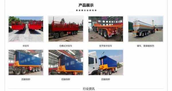 目前我公司生產(chǎn)集裝箱平板半掛車、集裝箱運(yùn)輸車、主車、半掛自卸車、各種系列半掛車、全掛車、廂式貨車、車輛運(yùn)輸車、上海50掛、天津60掛車,車輛噸位從8噸*60噸不等,產(chǎn)品種類有40多種,并承接專用車及**車輛的改裝設(shè)計(jì)業(yè)務(wù)。采用新技術(shù)、新工藝、新材料,及時(shí)聽(tīng)取市場(chǎng)反饋,快速把握市場(chǎng)先機(jī),勇于創(chuàng)新,專用掛車經(jīng)過(guò)較近幾年的突破性發(fā)展,成為公司主流、主導(dǎo)產(chǎn)品,銷售量每年都以90%以上的速度遞增,在全國(guó)同行業(yè)中銷售排名前列。