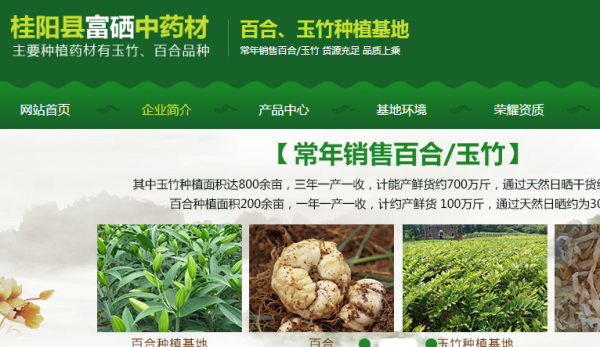 桂陽縣富硒中藥材有限公司位于歷史文化悠久、風景宜人、 氣候溫潤的湖南省桂陽縣。公司種植面積達到1000余畝,主要種植藥材有玉竹、百合品種。其中玉竹種植面積達800余畝,三年一產(chǎn)一收,計能產(chǎn)鮮貨約700萬斤,通過天然日曬干貨約有200萬斤。百合種植面積200余畝,一年一產(chǎn)一收,計約產(chǎn)鮮貨 100萬斤,通過天然日曬約為30萬斤。 2013年11月被桂陽人民政府評為桂陽縣農(nóng)業(yè)產(chǎn)業(yè)化龍頭企業(yè)。桂陽縣富硒中藥材有限公司以合作社及家庭模式共存,始終秉承“誠信,雙贏,綠色,生態(tài)”的發(fā)展理念。堅持以科 技為依托,以市場為導向,產(chǎn)學研相結(jié)合,按照生態(tài)化、資源化、無害化的原則進行生態(tài)藥材種植和林下生態(tài)養(yǎng)殖,以追求“綠色原生態(tài)”中藥材 為目標,建成綠色生態(tài)種植和休閑觀光一體,覆蓋研發(fā),種植,加工, 銷售全產(chǎn)業(yè)鏈的藥材公司在經(jīng)營上貫徹“人本、誠信、為民”的服務宗旨,奉行“規(guī)范管理、質(zhì)量為上、信譽至上、共創(chuàng)雙贏”的企業(yè)理念。